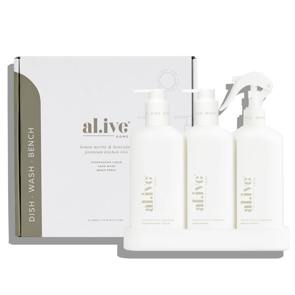 Elevate your kitchen experience with our Lemon Myrtle & Honeydew Kitchen Trio in crisp white. This set includes our Dishwashing Liquid, Bench Spray and Hand Wash, all conveniently nestled within a beautifully designed custom tray to enhance your kitchen countertop.