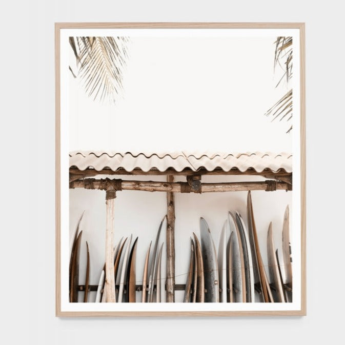 Get a glimpse of the beach life with our SURFBOARD LINEUP FRAMED PRINT. Featuring a stunning display of various surfboards neatly lined up in storage by the beach, this print will bring the laid-back vibes of the ocean to your home. Perfect for any surf lover or beach enthusiast!
